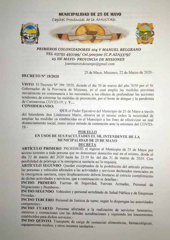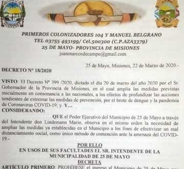 Decreto 018/2020 Restricción de ingreso al Municipio,Horario de atención de los comercios y circulación en la vía pública.»