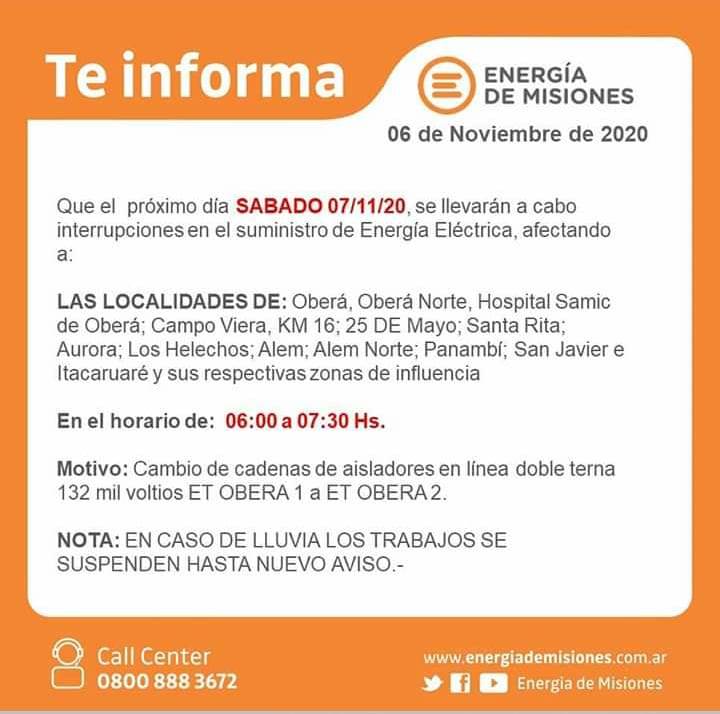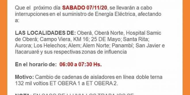 25 de Mayo – Mañana sábado habrá un corte programado en el servicio eléctrico de 6 a 7.30 horas Redaccion lacueva noviembre 6, 2020 Locales, Noticias, Provinciales Leave a comment 293 Views Energía de Misiones (Ex EMSA) informa que realizará un corte programado de energía eléctrica, mañana sábado 07 de noviembre de 06 a 07.30 horas sobre la línea Roca – Oberá para realizar mantenimiento preventivo. 2020-11-06 Redaccion lacueva Share Facebook Twitter Google +