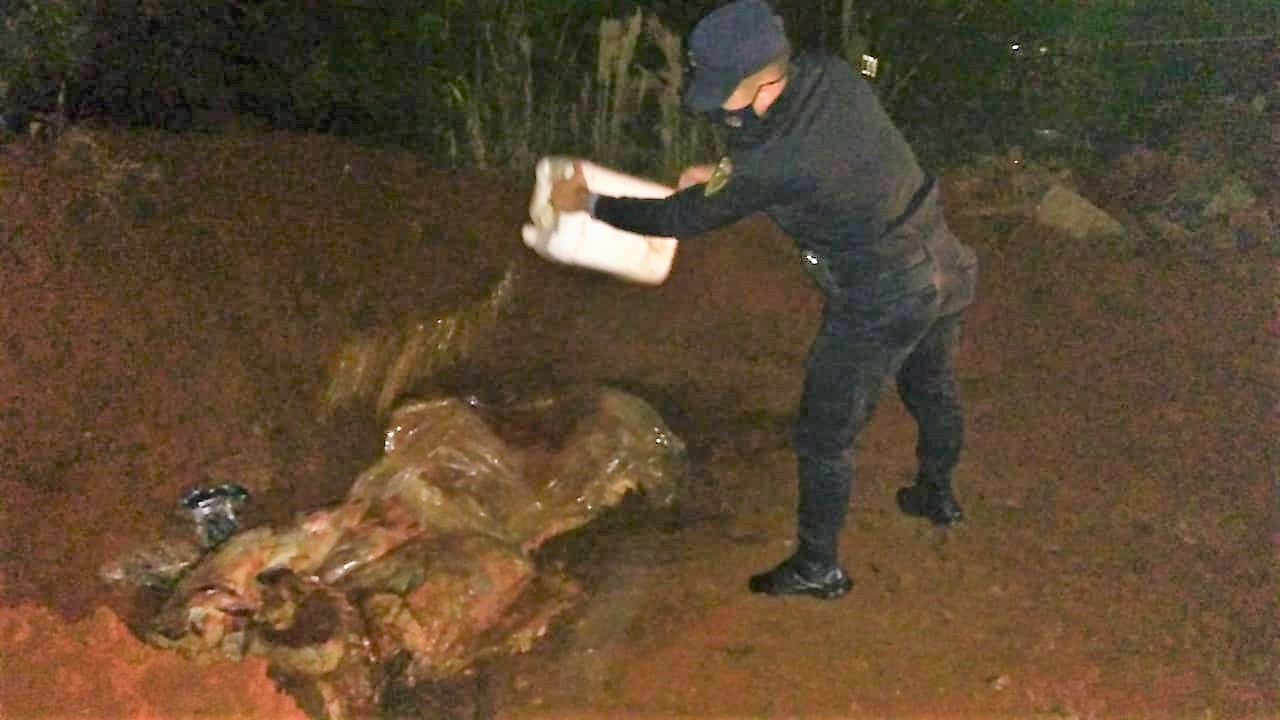 Posteriormente se procedió al decomiso y desnaturalizacion de la carne vacuna conforme a lo dispuesto por el SENASA de esta Localidad haciendolo en el predio del Basural Local.
