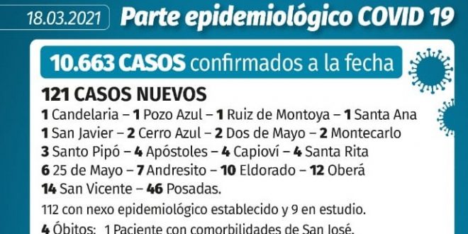 En el parte epidemiológico difundido por Salud Publica de la provincia este jueves se confirmaron 121 CASOS NUEVOS 10.663 CASOS confirmados a la fecha.