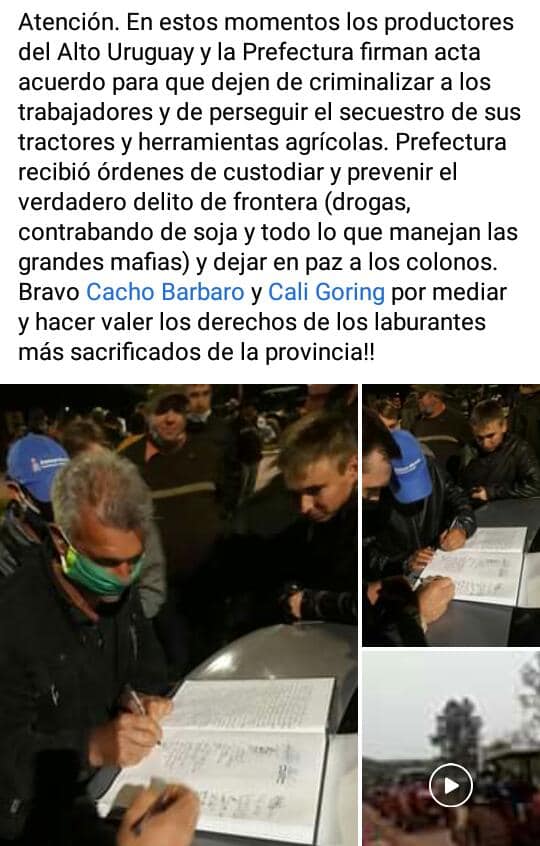 Luego del tractorazo de ayer que se realizó al costado de la ruta 2 y en el acceso a la localidad, agricultores de Colonia Aurora e integrantes de Prefectura a instancias de la intervención de distintas autoridades nacionales, municipales y provinciales sellaron un acuerdo y con ello se levantó la medida de protesta. El intendente Carlos Goring expreso que “se llegó a un acuerdo en el que Prefectura dará una tregua y colaborará con los productores, hasta que los municipios hagan un relevamiento y registro de las maquinarias de los colonos”.