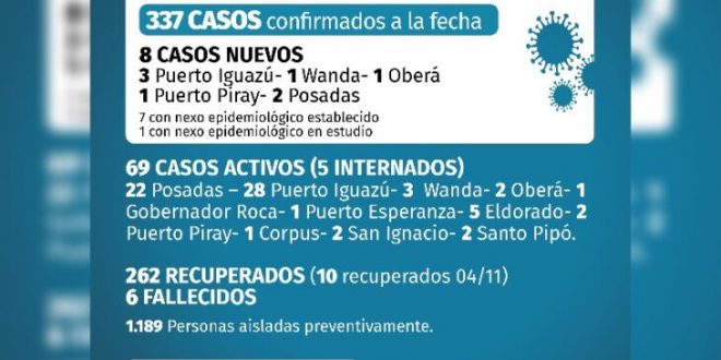 En el reporte sanitario se informó que, con 5 internados, actualmente son 69 los casos activos en la provincia, encabezando Puerto Iguazú esa lista con 28 infectados que actualmente. Lo sigue Posadas con 22, Eldorado 5, Wanda 3, San Ignacio 2, Santo Pipó 2, Oberá 1, Gobernador Roca 1, Puerto Esperanza 1, Puerto Piray 1 y Corpus 1.