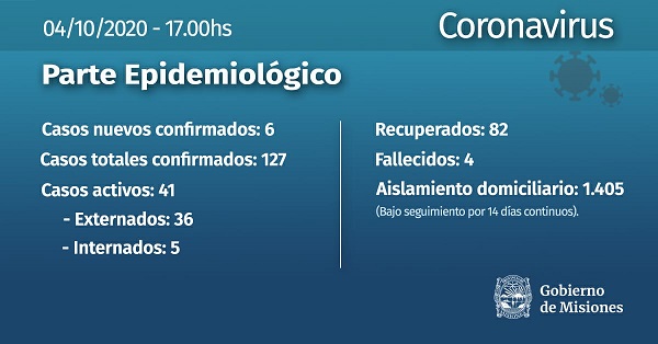 Según el parte epidemiológico elaborado por el Ministerio de Salud de Misiones, en la provincia se confirmaron seis nuevos casos de coronavirus en las últimas 24 horas. Todos tienen nexos epidemiológicos establecidos. Por otro lado, se sumó un recuperado más. Con esto, el total de infectados en Misiones es de 127 y 82, recuperados.