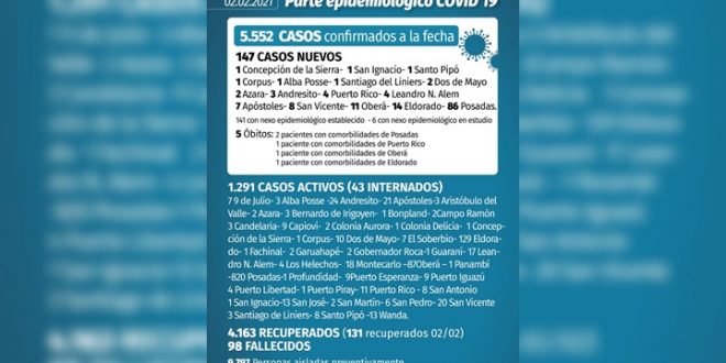 De los cinco fallecidos dos son de Posadas, 1 de Puerto Rico, 1 de Oberá y otro de Eldorado. En todos los casos se trató de pacientes con comorbilidades. Ascendió a 98 el número de fallecidos. En tanto que los 147 casos nuevos, 86 en Posadas, llevaron a 1.291 los casos activos, de los cuales hay 43 pacientes internados. Se trata de lo informado este martes en el parte epidemiológico del Ministerio de Salud Pública de Misiones