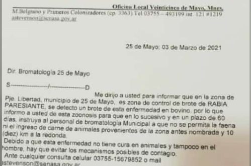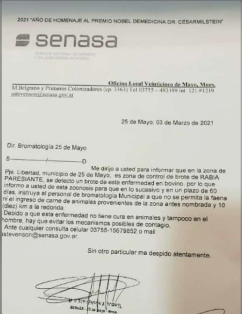 El Servicio Nacional de Sanidad y Calidad Animal (SENASA) detectó un brote de rabia paresiante en la localidad de 25 de Mayo.