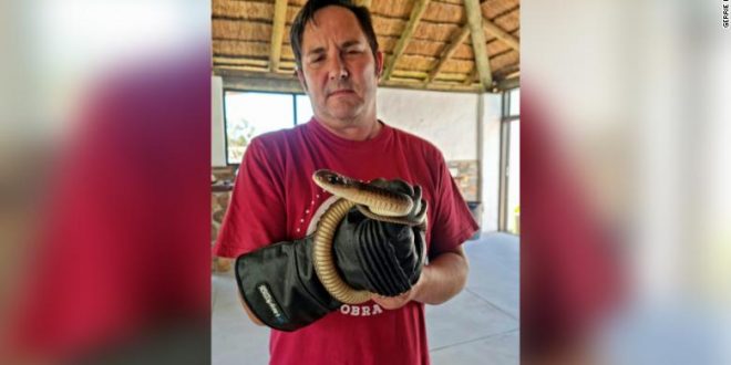 Luego lo sujetó por detrás del cuello y lo colocó en un «tubo para serpientes». Al anochecer, Heyns se llevó el reptil a casa, donde lo alojó temporalmente en un recinto para serpientes antes de liberarlo de nuevo en la naturaleza el domingo.