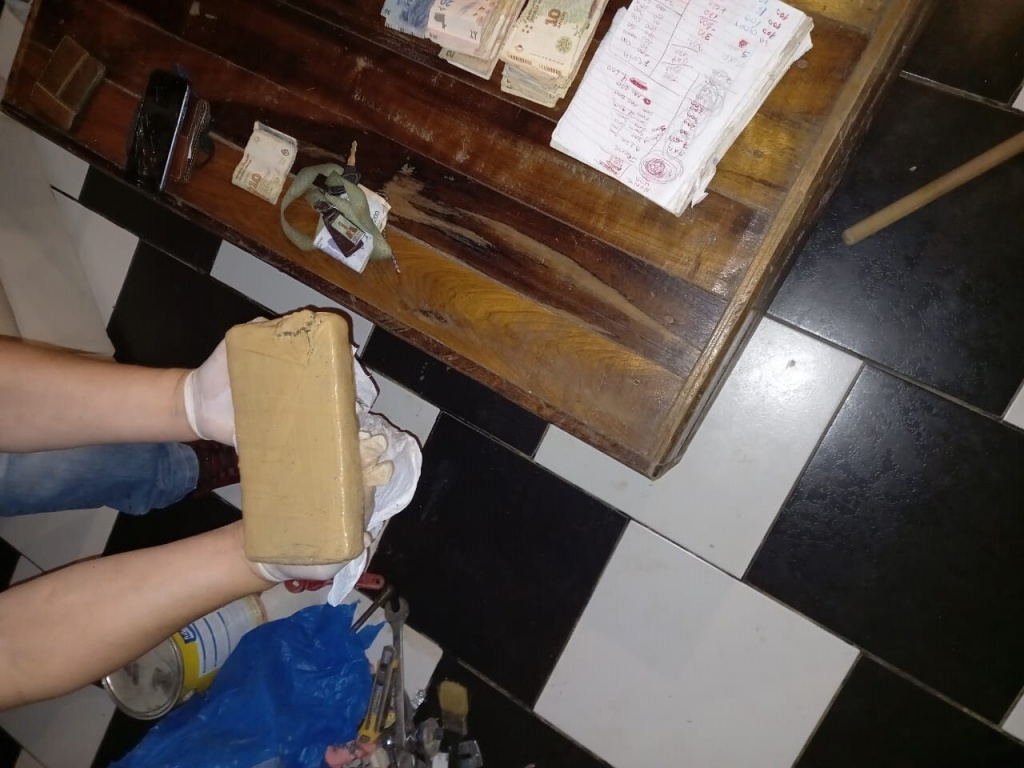 En la revisión del lugar, los policías encontraron una balanza de precisión usada comúnmente para pesar pequeñas cantidades de estupefacientes, alrededor de 806 gramos de una sustancia que sometida al test dio positivo para marihuana y dinero en efectivo, escondido debajo de un colchón en una de las habitaciones y otra parte en la caja registradora del supuesto comercio.