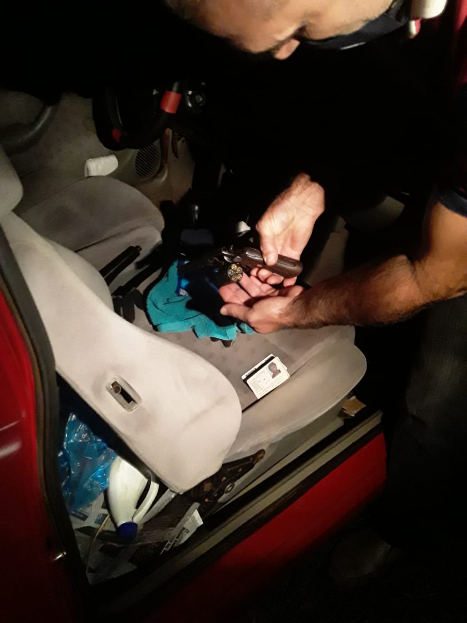 Cuando el Personal Policial realiza una requisa en el rodado perteneciente al ciudadano MOULS en presencia de dos testigos habiles se hallo debajo del asiento del acompañante envuelto en un toalla *(01) Revolver calibre 38 mm marca ROSSI culata de madera con tambor de cinco proyectiles N° D974041 y (05) proyectiles sin percutar marca SPL.