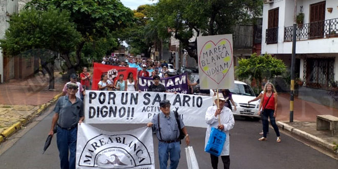 LA PRIMERA. Días atrás representantes de Marea Blanca, UDNAM , MPL, UTEM, ATE y Tribuna Docente, se movilizaron en Posadas también en repudio al acuerdo salarial del 20%