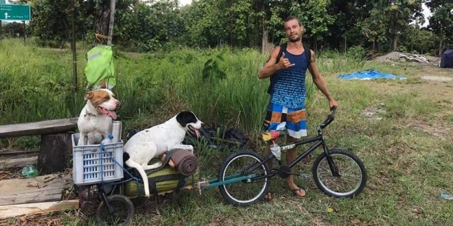 El misionero contó que vivió diversas experiencias, incluso le robaron la billetera con sus documentos y el dinero que tenía para solventar sus gastos. Poco después, compró una bicicleta: “Vendí mi tabla de surf y compré la bici. Le tuve que hacer muchas modificaciones y agregarle un carrito para llevar a los perros, porque ellos no pueden caminar mucho”.