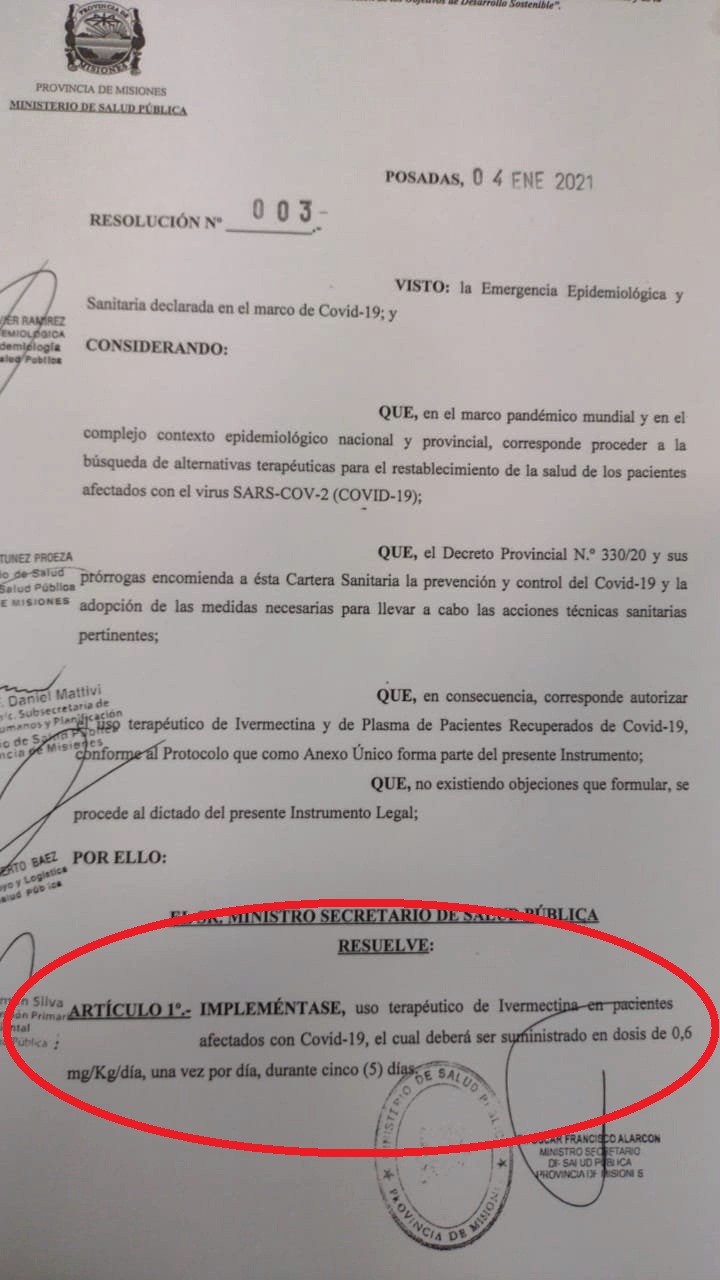 Finalmente, las autoridades provinciales decidieron que teniendo en cuenta el contexto sanitario de la pandemia y la incidencia epidemiológica en Misiones, que se comience la utilización de la Ivermectina. Su aplicación será en una dosis diaria de 0,6 mg durante cinco días.
