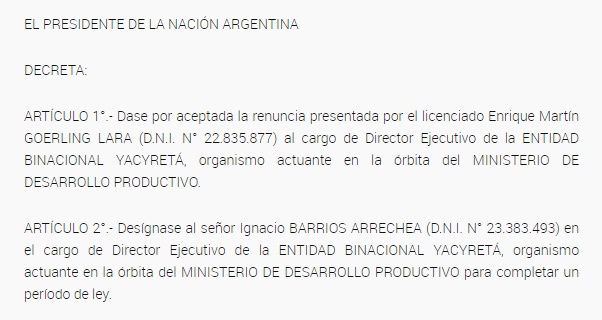 Se publicó en el Boletín Oficial el Decreto N° 523/2020 por el cual el presidente Alberto Fernández aceptó la renuncia presentada por Enrique Martín Goerling Lara al cargo de Director Ejecutivo de la Entidad Binacional Yacyretá y designa en el mismo instrumento legal a Ignacio Barrios Arrechea (47), empresario pyme maderero e hijo del ex gobernador Ricardo Barrios Arrechea, como nuevo titular del organismo “actuante en la órbita del Ministerio de Desarrollo Productivo para completar un período de ley”.