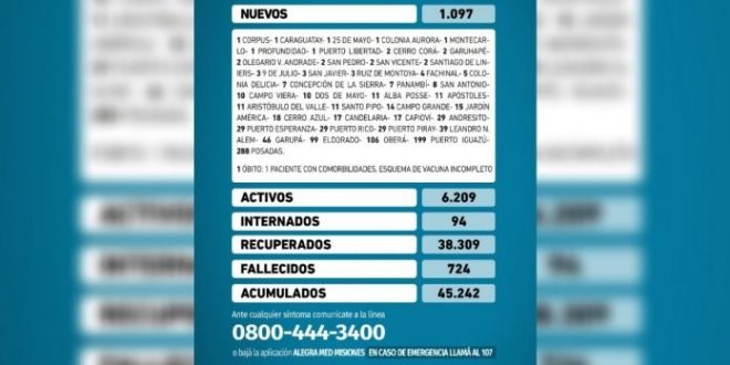 El Ministerio de Salud confirmó 1097 casos de coronavirus en Misiones este jueves, un nuevo pico durante la pandemia, y se notificó una muerte por la enfermedad en las últimas 24 horas. De esta manera, la provincia alcanzó los 45.242 contagios y ascendió a 724 las víctimas fatales.