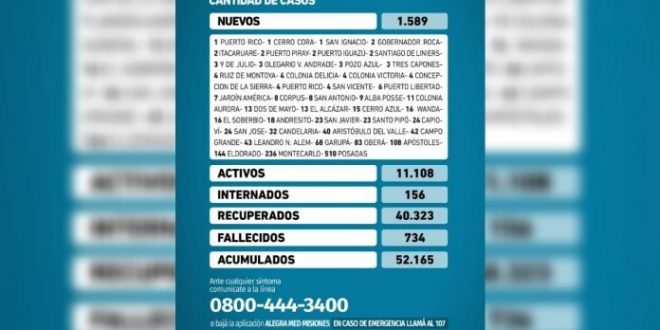 La provincia alcanzó los 52.165 infectados y son 734 fallecidos por el virus de la pandemia. También son 40.323 las personas que superaron la enfermedad en la Tierra Colorada y hay 11. 108 los contagios activos.