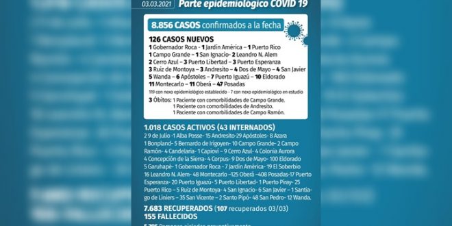 El Ministerio de Salud de Misiones anunció este martes 126 casos de coronavirus Covid-19 y tres muertes. De esta manera a provincia alcanzó los 8856 contagio desde que se inició la pandemia y las 155 víctimas fatales.