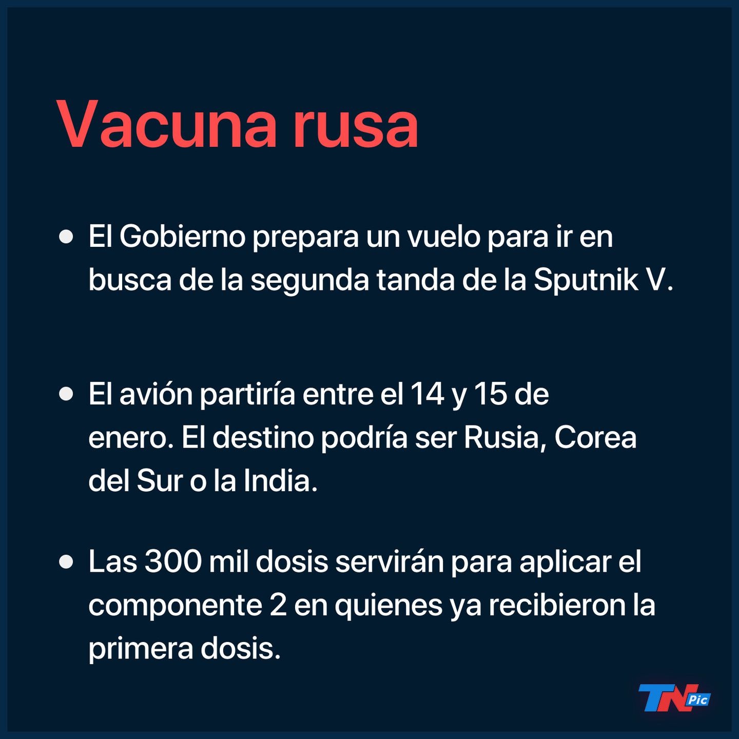 El Gobierno de Alberto Fernández trabaja para la próxima semana parta un vuelo de Aerolíneas Argentinas en busca de la segunda tanda de vacunas rusas Sputnik V que servirán para completar la aplicación de quienes ya recibieron la primera dosis. Según pudo saber TN.com.ar en base a fuentes oficiales, una aeronave partiría entre el 14 y el 15 de enero para regresar al día siguiente con 300 mil dosis del componente dos.